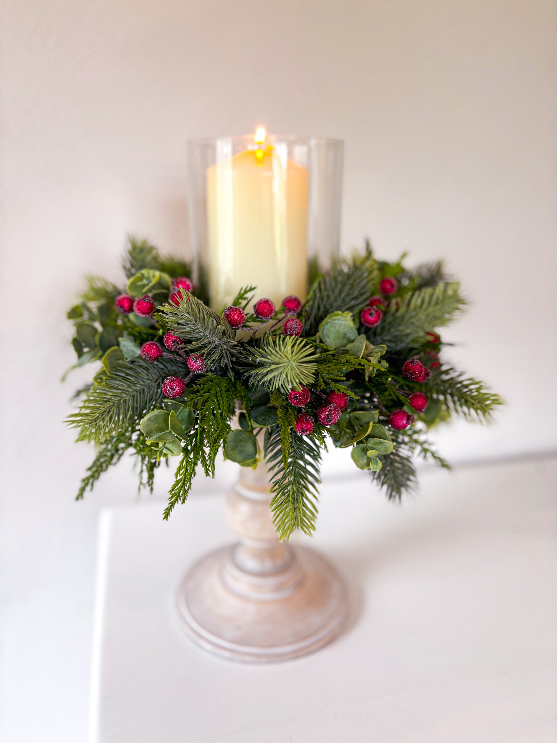 White washed wooden large Pillar candle holder with faux eucalyptus & red berries floral wreath and decorative velvet bow ribbon detail, which can be taken off or on easily.