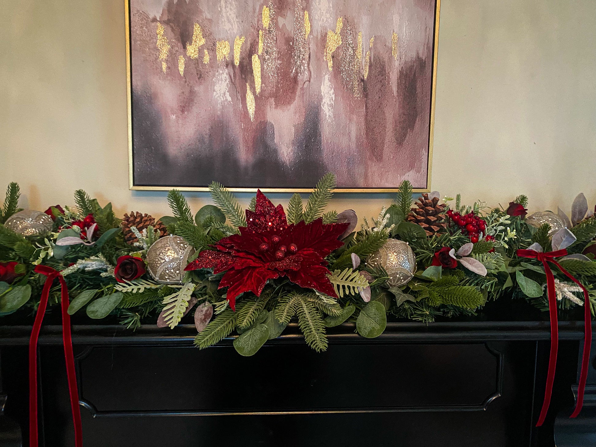 Thick base of pine, ivy, eucalyptus and fern with rich deep red velvet & glitter poinsettias, burgundy lambs ear, burgundy roses, hawthorn berries, large pine cones and luxury baubles finished off with slim velvet bows.