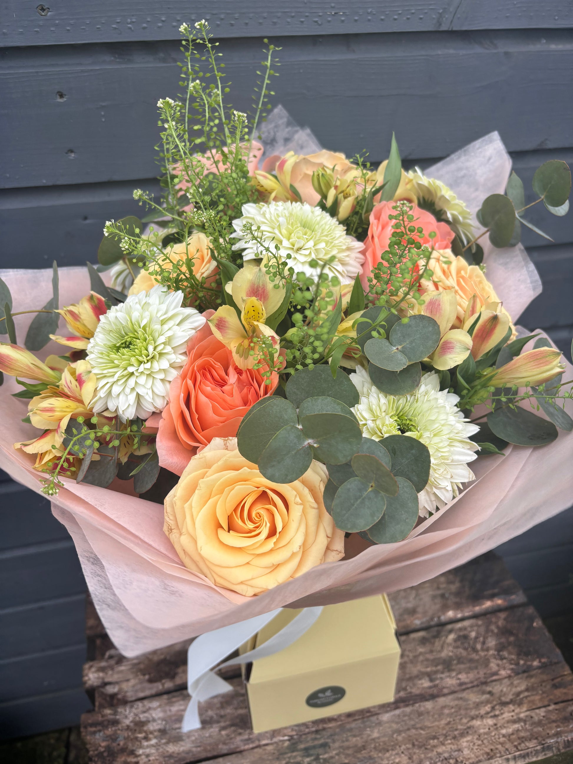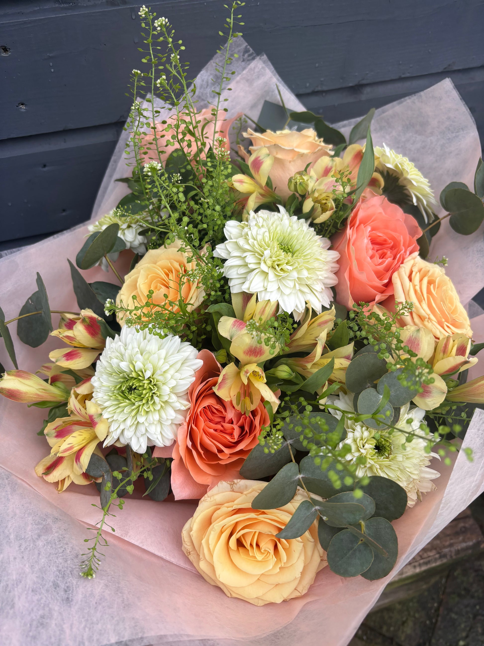 Handtied fresh flower bouquet with a mix of Roses, Alstroemeria, Limonium, Ruscus & Irish Eucalyptus foliage.
