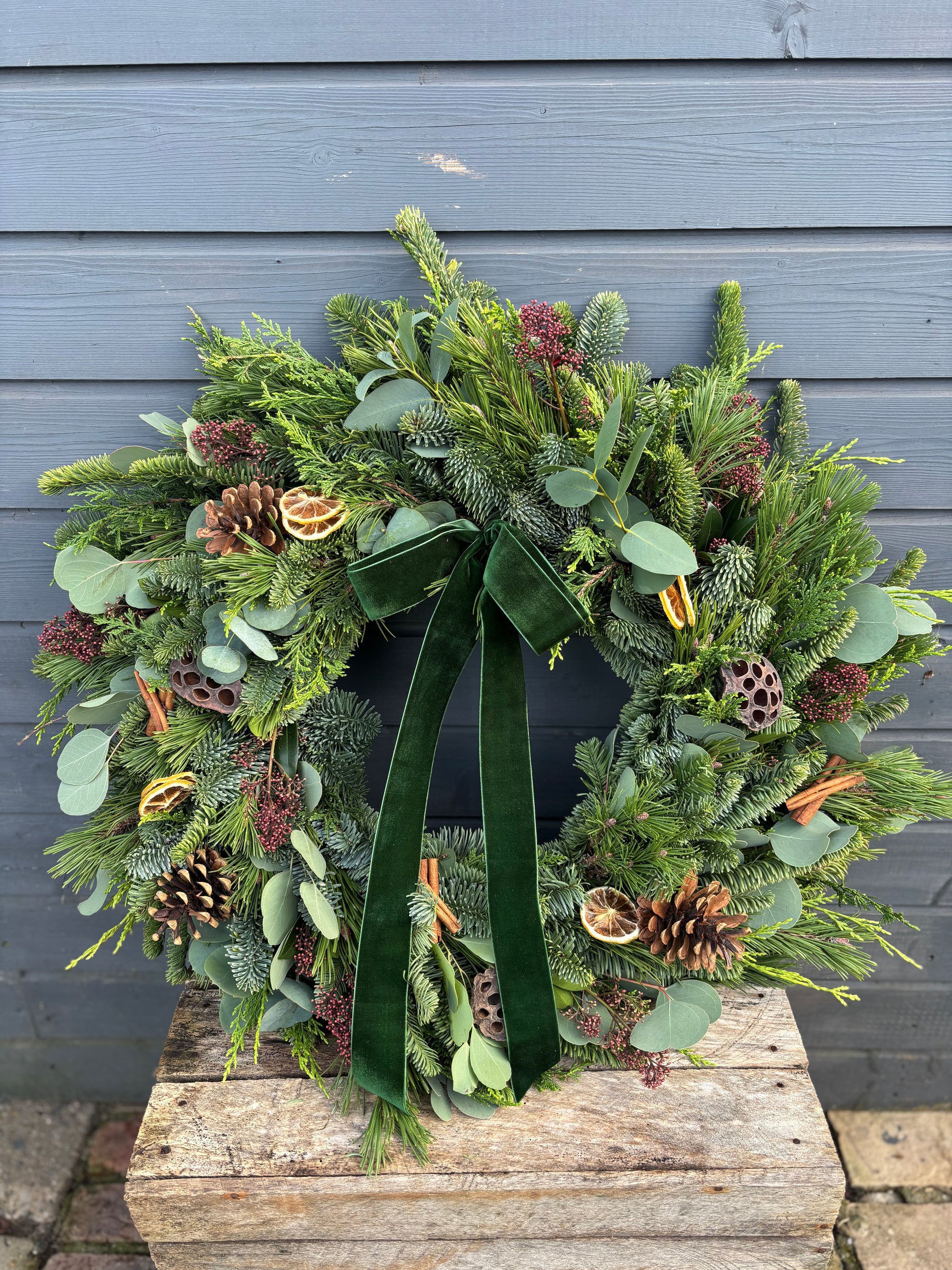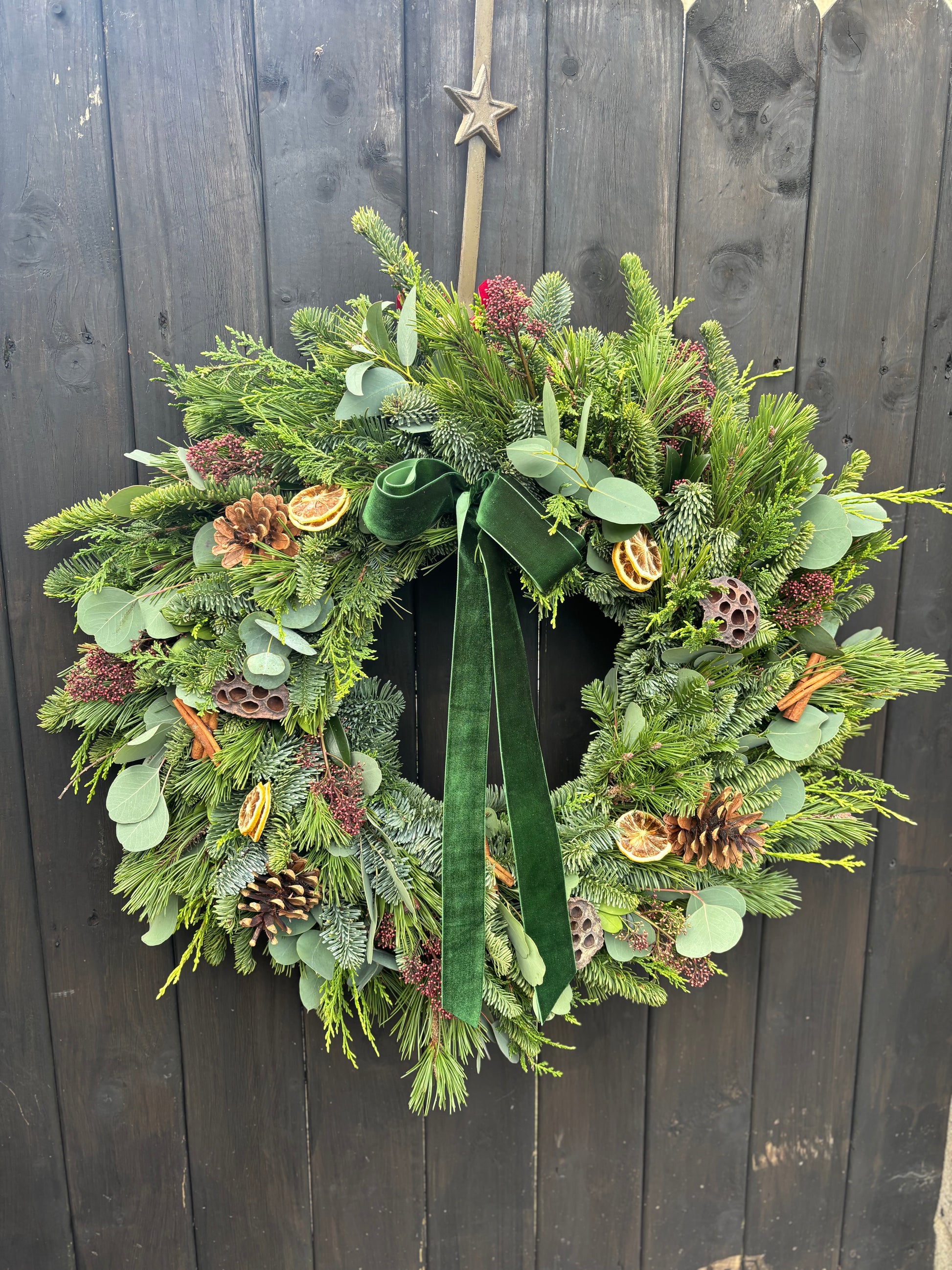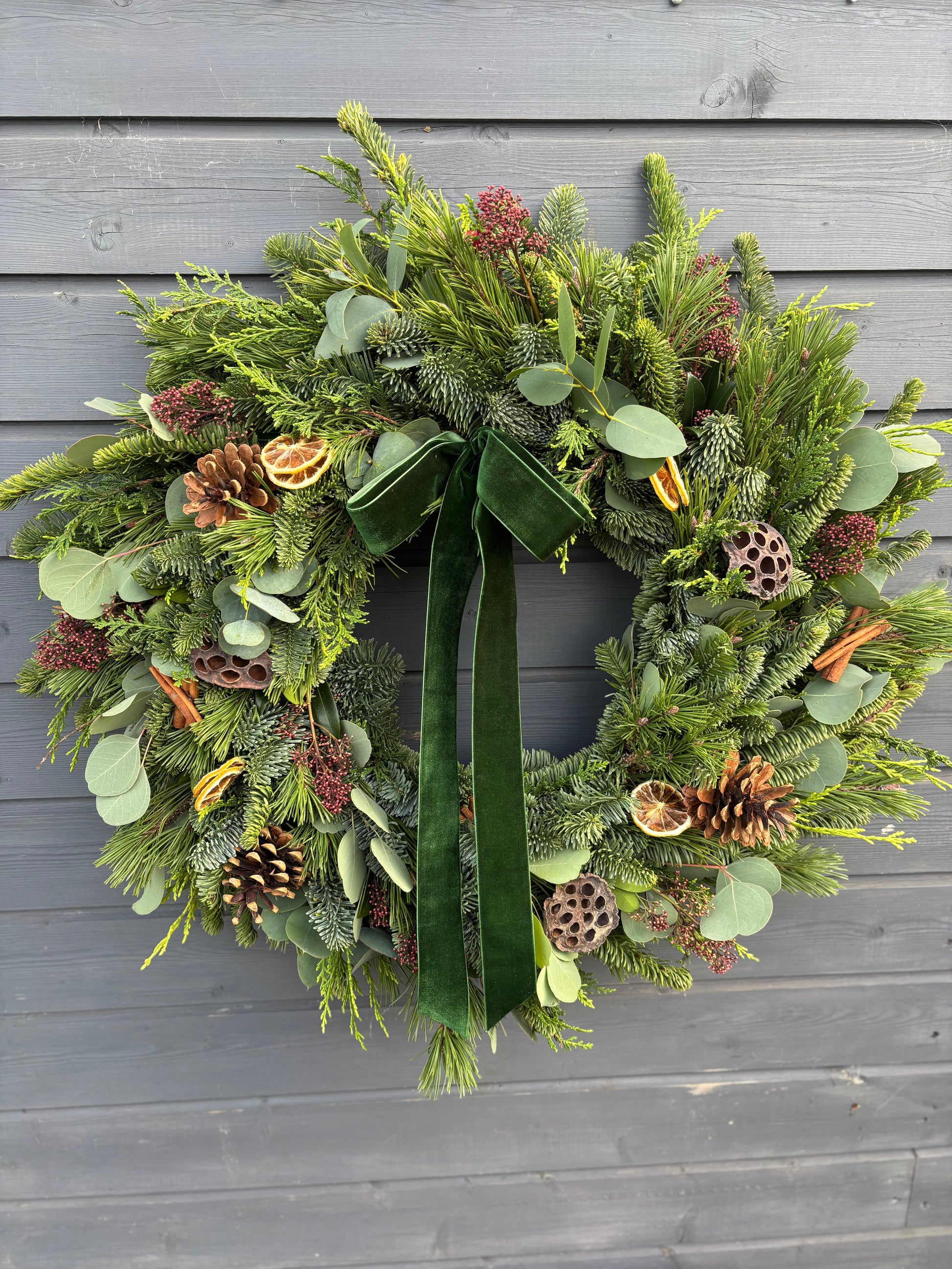 Extra large fresh Irish foliage winter wreath with Nobilis Fir, Leyland Cypress, Mugo Pine, Skimmia Rubella and different varieties of Eucalyptus. Simply decorated with pine cones, lotus heads, dried lemon slices, cinnamon sticks and luxury green velvet ribbon. Classic & elegant winter style.
