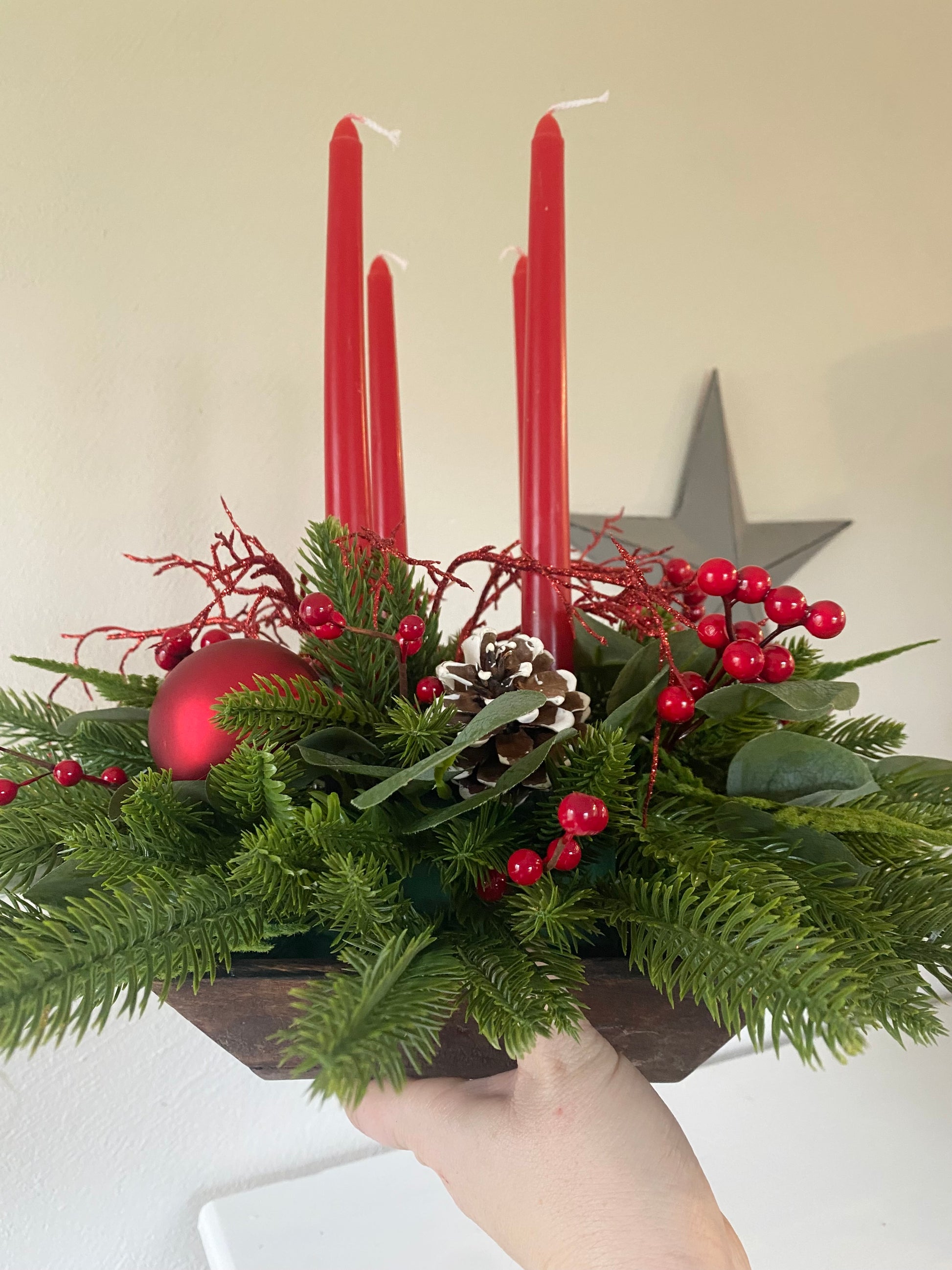 Large red Christmas themed table candle centrepiece arrangement in square wooden dish. Includes 4 red candles.