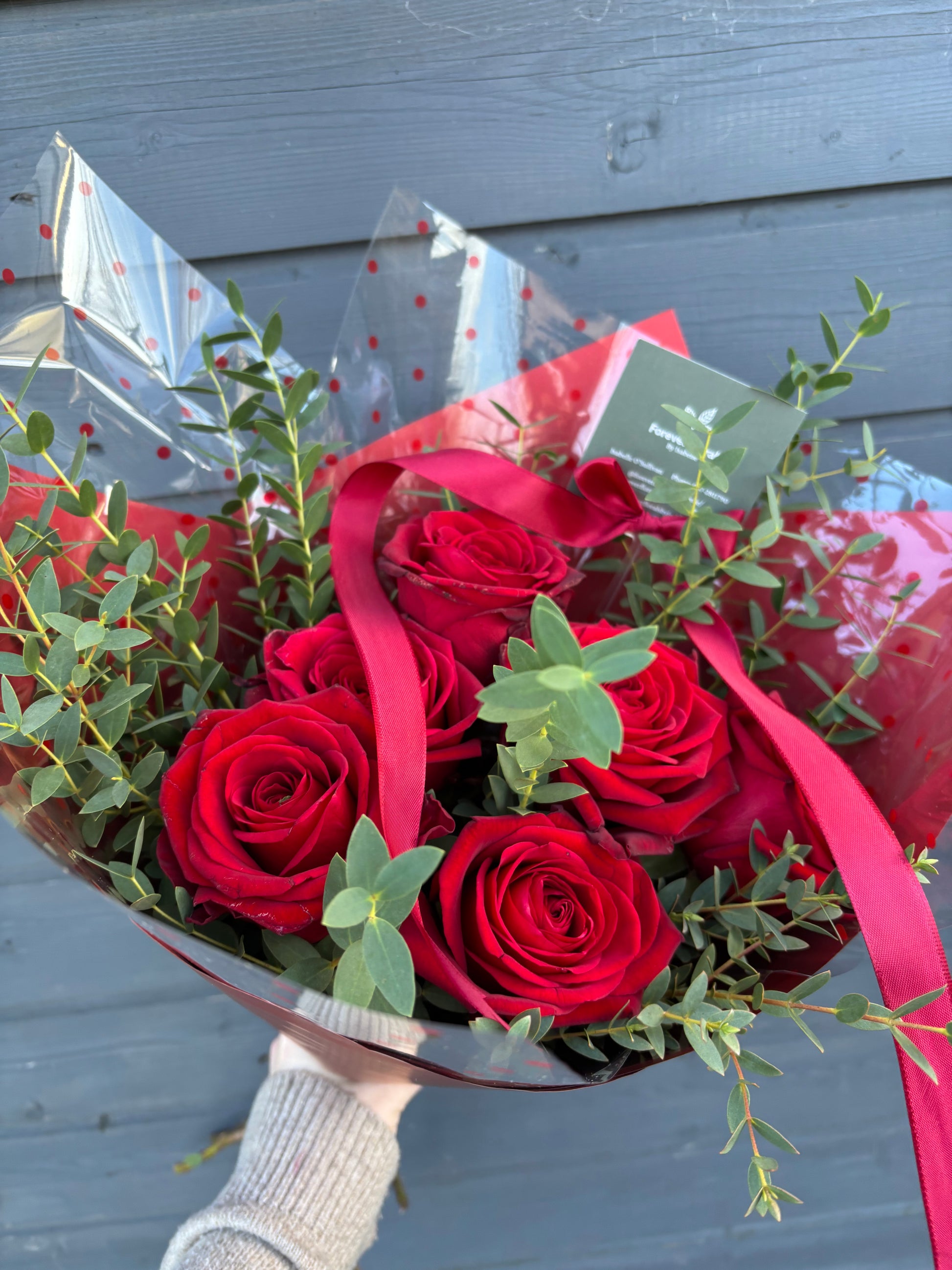 Handtied fresh flower bouquet - Mix of Red Roses with fresh Irish greenery. Includes gift wrapping and paper vase. Valentine's card is also available