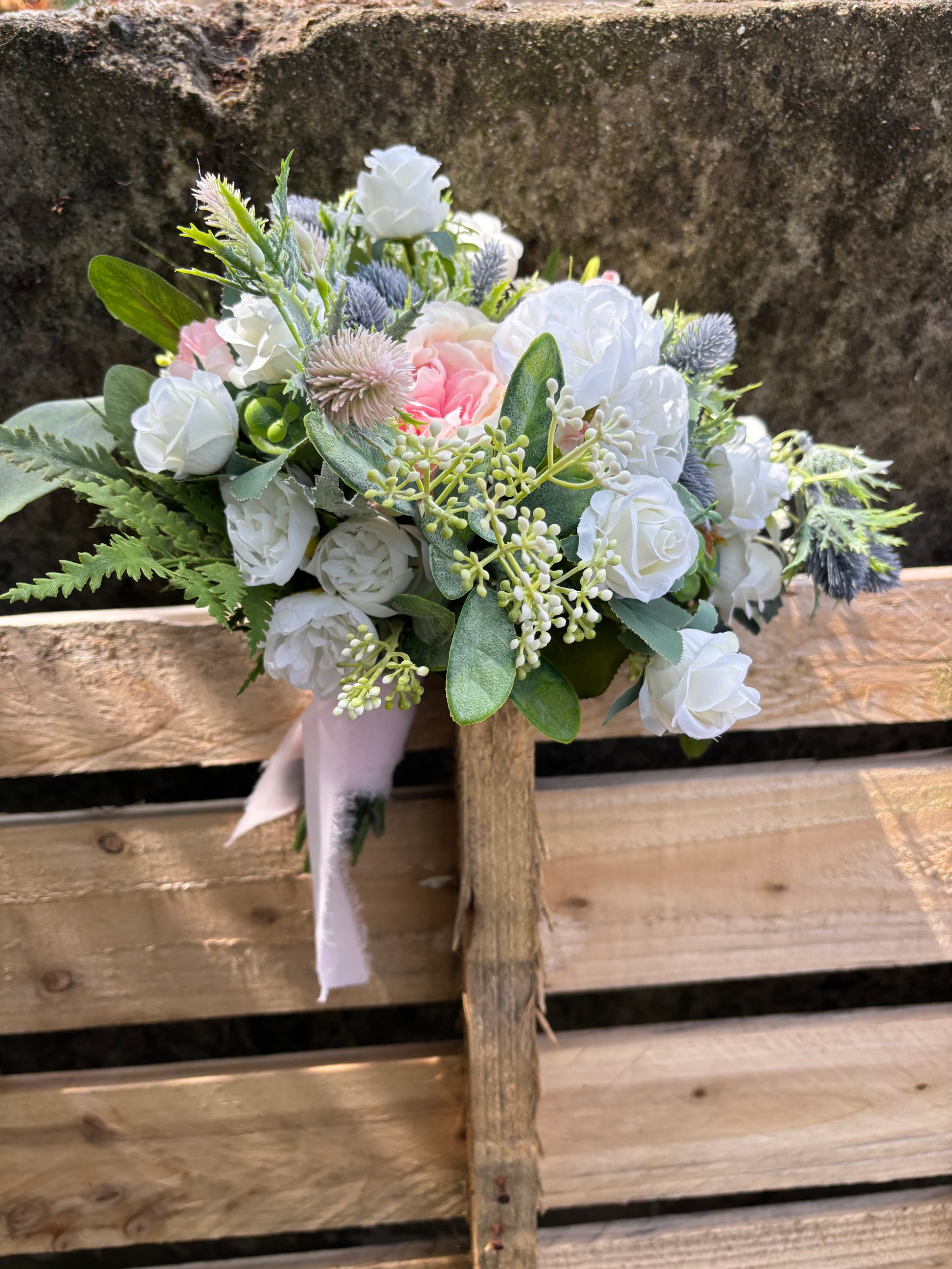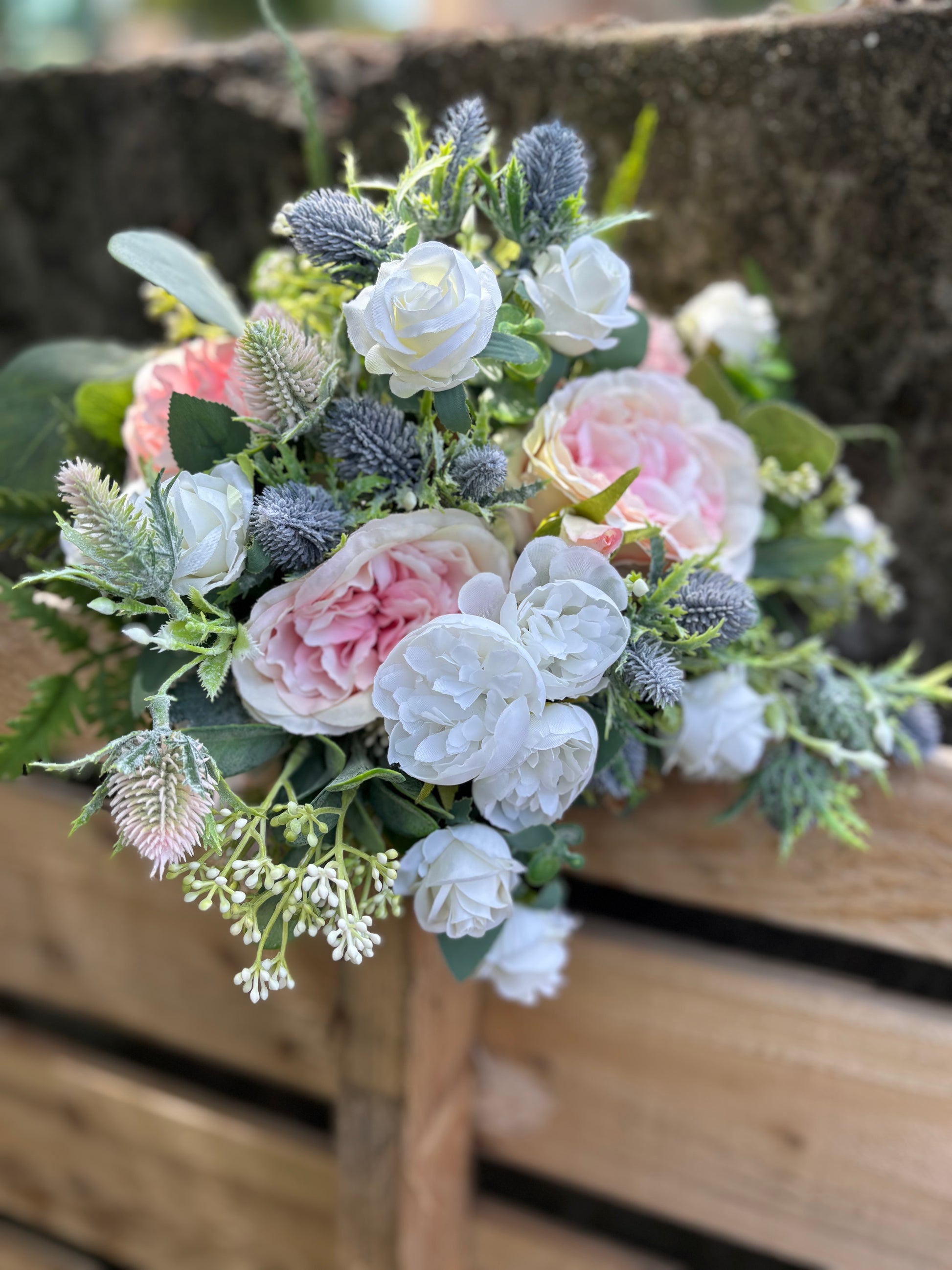 Mixed Eucalyptus & Fern foliage with Blue & Pink Thistles, Mini White berry flowers, White mini Peonies, Small White Roses and large Pink David Austin Roses. Wrapped and tied with Pale pink chiffon ribbon.