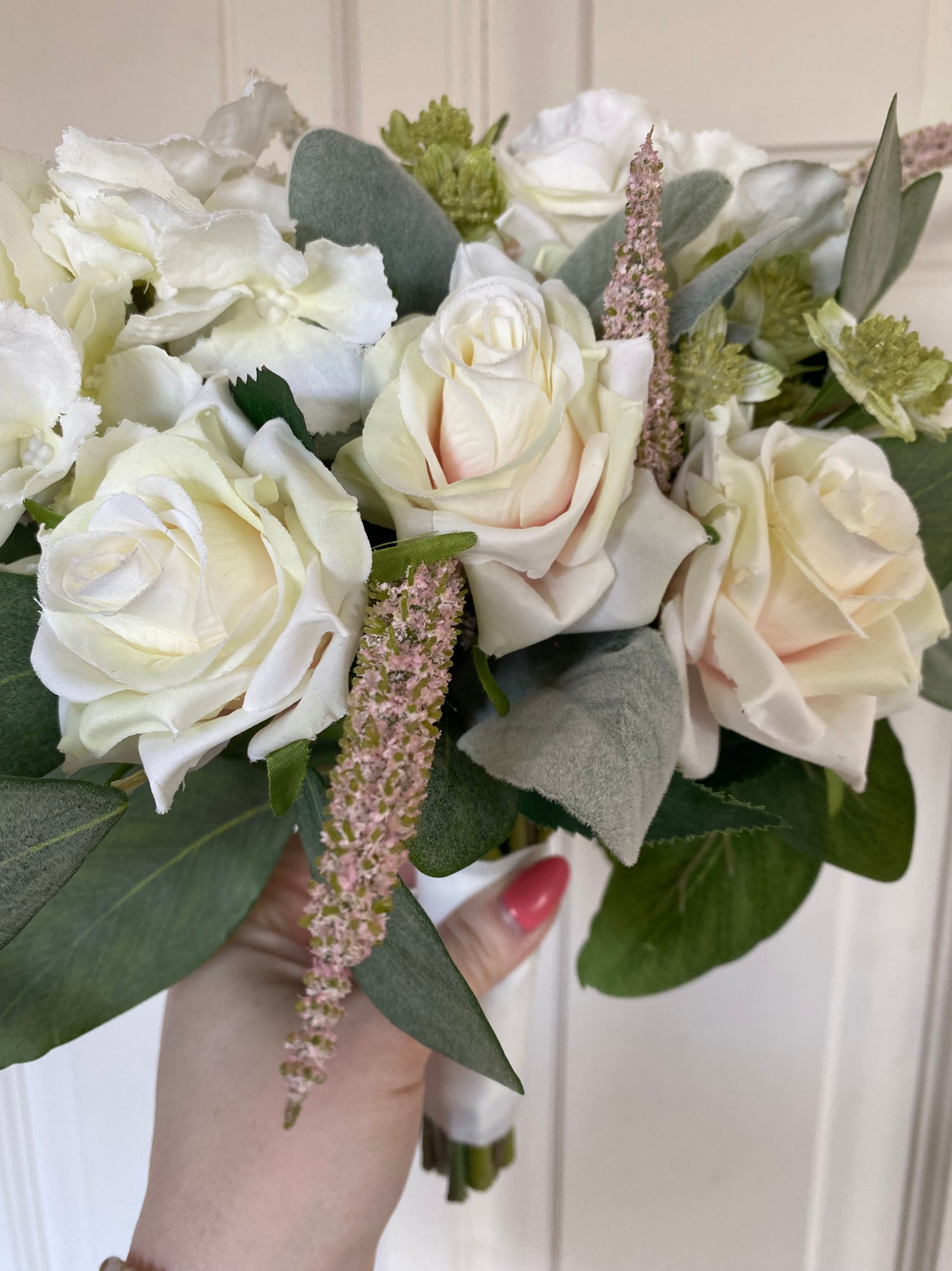 Eucalyptus & Lambs Ear Foliage base with Ivory & Pale Pink Arundel Roses, Ivory Hydrangea, Green Astrantia and Pink Veronica Flowers. Wrapped in Ivory Ribbon.